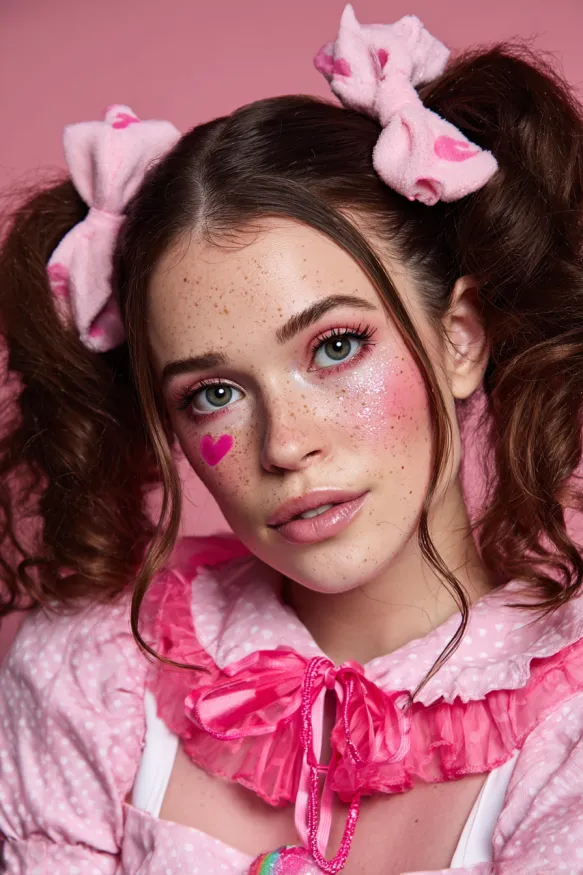 This makeup shines with playful pink tones and glittery blush that give a youthful, doll-like charm. A small pink heart detail on the cheek adds a whimsical touch, while fluttery lashes and glossy lips enhance the sweetness. Her curly pigtails tied with oversized pink bows complete the look, perfectly matching the ruffled pink outfit.
