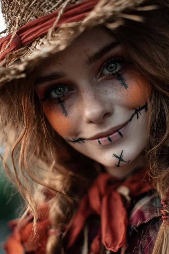 This makeup blends playful charm with a touch of spookiness. Bright orange blush is blended around the eyes and nose, while black stitch lines run across the mouth and under the eyes to mimic a stitched-up scarecrow face. The warm tones pair beautifully with her tousled braids and straw hat, completing the rustic harvest theme.