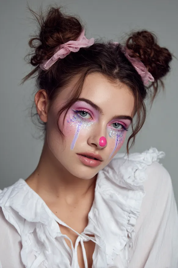This makeup is all about soft colors with a fun twist. Pink eyeshadow blends across the lids, paired with glitter tears cascading from the lower lash line in shimmering blue and purple hues. A bright pink clown nose adds the perfect whimsical touch, while the rest of the face stays natural and fresh. The hairstyle, with two messy buns tied up in pink scrunchies, enhances the playful vibe and ties the look together beautifully.