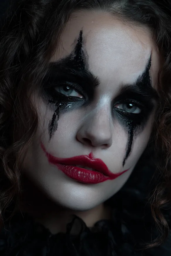 This look channels a hauntingly artistic take on clown-inspired makeup. Black eyeshadow is smudged dramatically upward and downward from the eyes, creating the illusion of dripping paint or smeared tears. A bold red smile stretches beyond the lips, painted with sharp edges to give a sinister, theatrical finish. The pale base enhances the intensity of the black and red details, while her slightly undone curls add to the unsettling mood.