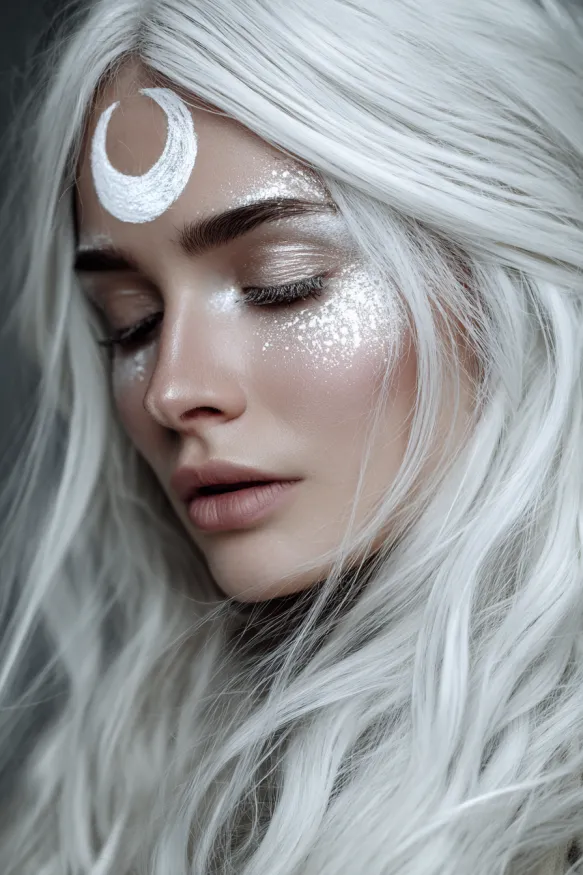 This style radiates ethereal beauty with shimmering silver highlights around the eyes and cheeks, creating a glowing halo effect. A bold white crescent moon is painted on the forehead, serving as the central mystical detail. The long, icy white hair flows effortlessly, blending seamlessly with the silvery makeup for an otherworldly, goddess-like finish.