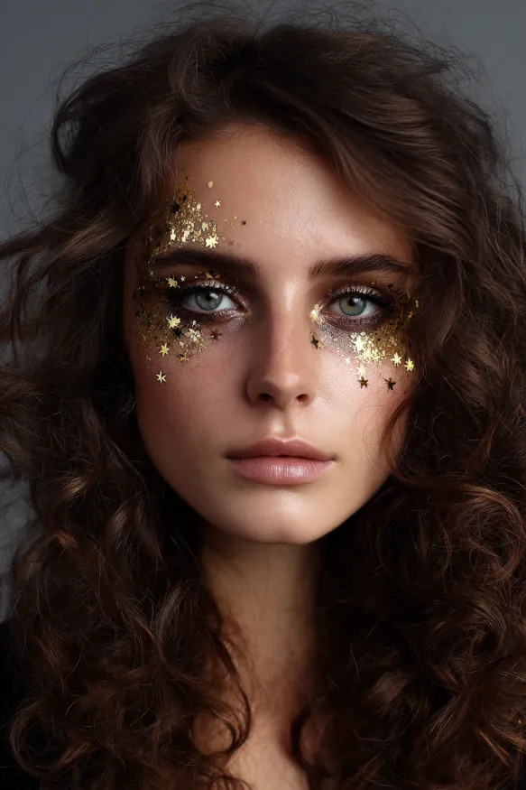 This makeup dazzles with metallic gold glitter sweeping dramatically across the eyes and cheeks, accented with tiny star confetti for a celestial effect. The smoky shadow beneath enhances the depth, while the natural lip color keeps the focus on the shimmering constellation-inspired design. Her voluminous curls frame the face beautifully, making the look both radiant and mysterious.