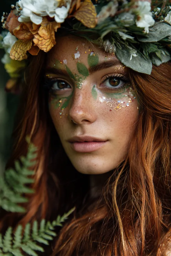 This makeup embraces earthy tones with green leaf-like designs painted around the eyes, softened by golden glitter and shimmering highlights. The freckles peek through naturally, adding to the woodland charm. A lush floral crown made of dried leaves and blooms enhances the mystical vibe, while her long auburn hair flows freely to complete the enchanting forest spirit effect.