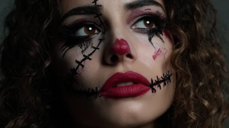 I really like this look because it perfectly blends creepy and cute. The rosy cheeks give it that old-fashioned doll vibe, while the stitched details make it unmistakably Halloween. It’s fun, dramatic, and a little unsettling in the best possible way, making it a fantastic party look.