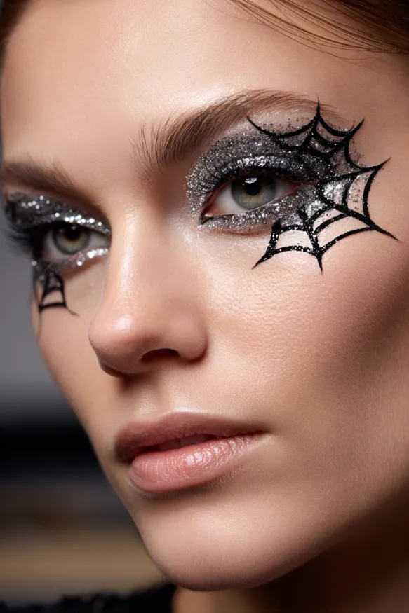 I love how this style feels like a mix of high-fashion runway makeup and classic Halloween fun. The glitter makes the whole look pop in photos, and the webs give it that unmistakable spooky vibe. It’s creative, memorable, and honestly such a cool way to turn eye makeup into the main event of your costume.