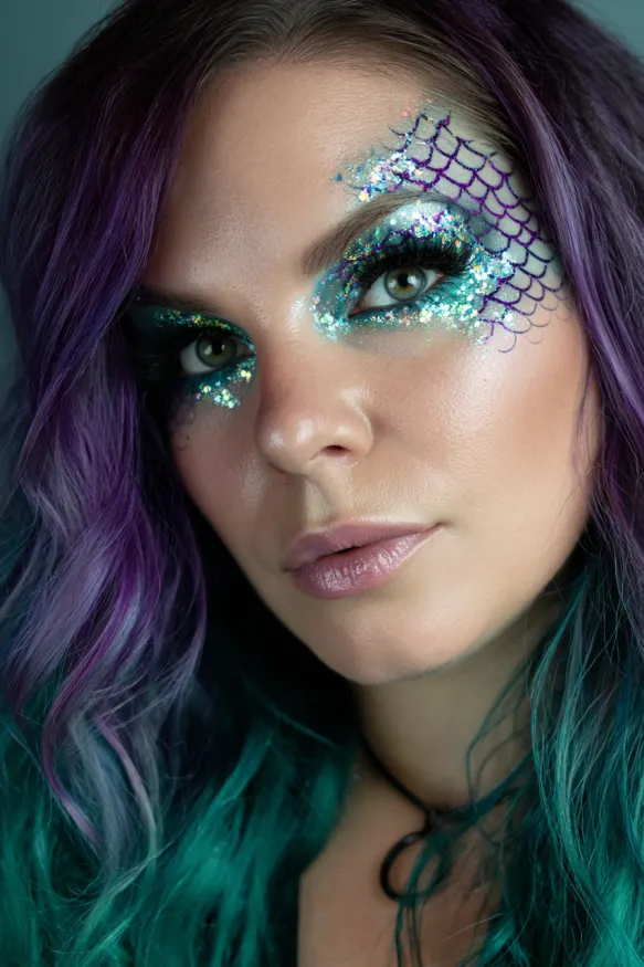 I love how whimsical and dreamy this makeup feels. The glitter catches the light in the prettiest way, and the scales add such a fun detail that instantly transforms the look into something special. It’s the kind of makeup that makes me feel like I’ve stepped straight out of a fairytale ocean scene.