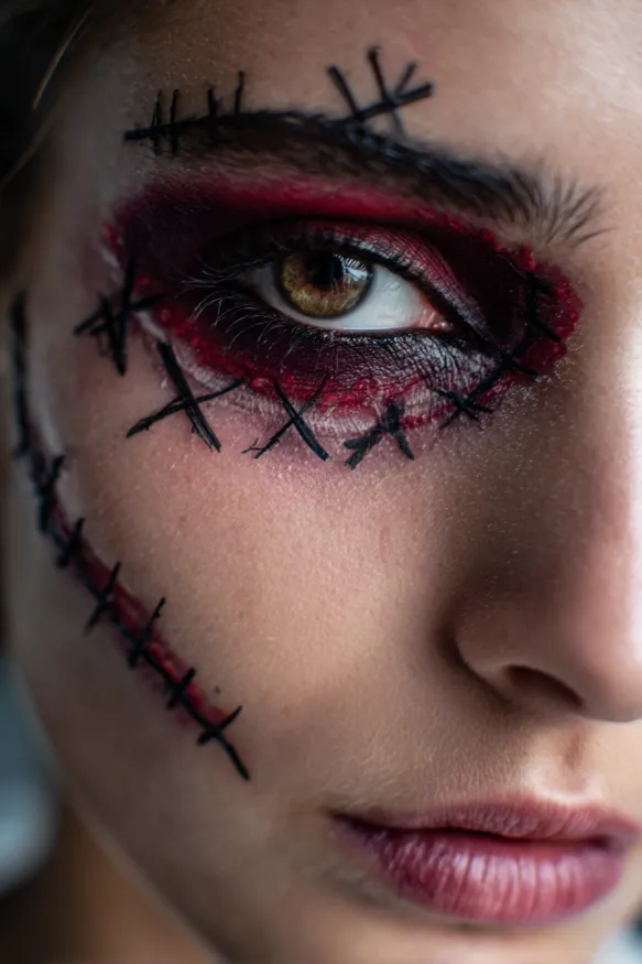 This intense look uses smudged red and black shadows to create a bruised, haunting effect around the eye. Black stitches are drawn across the eyelid and cheek, making it look as though the skin has been sewn back together. The raw, distressed vibe makes this makeup perfect for a creepy stitched-doll or Frankenstein-inspired Halloween style.
