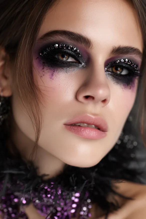 This glamorous look mixes deep purple and black shadows with shimmering silver highlights that create a smoky, dramatic effect. Rhinestones are carefully lined along the upper lids, catching the light and adding a dazzling edge to the dark base. The slight smudging of color beneath the eyes gives it a gothic vibe while keeping it chic and wearable.