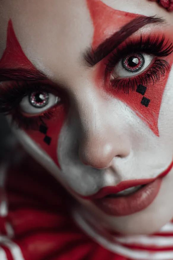 I love how this makeup manages to feel spooky but still so polished. The sharp red shapes instantly draw attention, and the dramatic eye contact makes it look both eerie and captivating. It’s the kind of style that would completely transform a clown costume into something unforgettable.