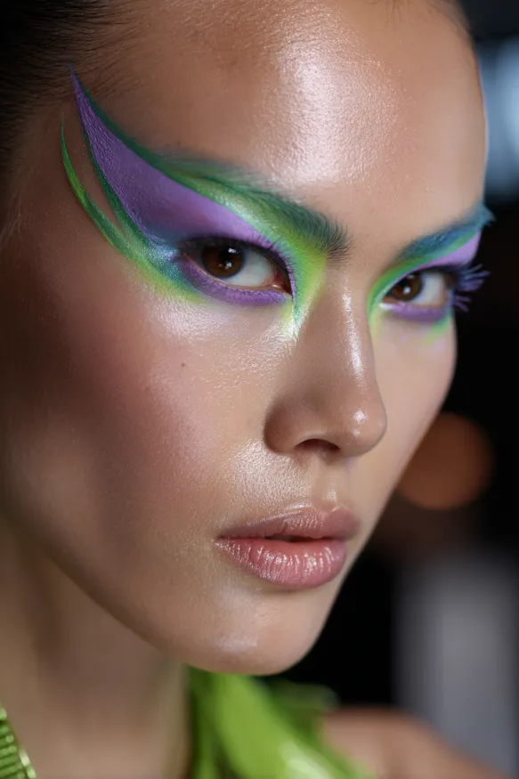 This bold look features neon green and violet shades blended into sharp, extended wings that reach toward the temples. The gradient colors shift from bright green in the inner corners to purple at the edges, giving the eyes an otherworldly glow. The sleek, sculpted design creates a futuristic, alien-inspired vibe that feels artistic and powerful.