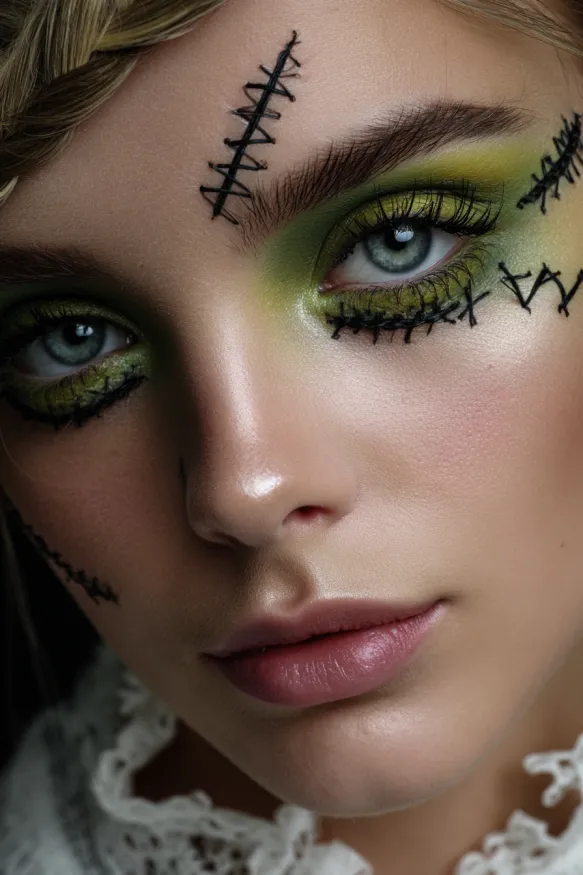 This look blends eerie stitches with vibrant green shadow that surrounds the eyes. Black stitch marks are painted across the forehead, cheeks, and eyelids, giving the effect of a patched-up doll or a Frankenstein-inspired creation. The soft blending of lime and moss tones in the shadow adds a fresh contrast against the dark detailing, making the eyes pop.