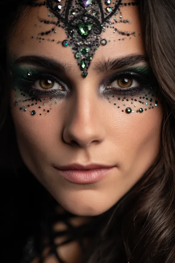 This dramatic look features smoky black and green shadow blended across the lids, paired with shimmering silver highlights to brighten the eyes. Intricate spiderweb-inspired designs extend from the forehead, adorned with emerald and jewel-toned rhinestones that catch the light beautifully. Smaller gems are scattered under the eyes, completing the regal and haunting spider queen effect.