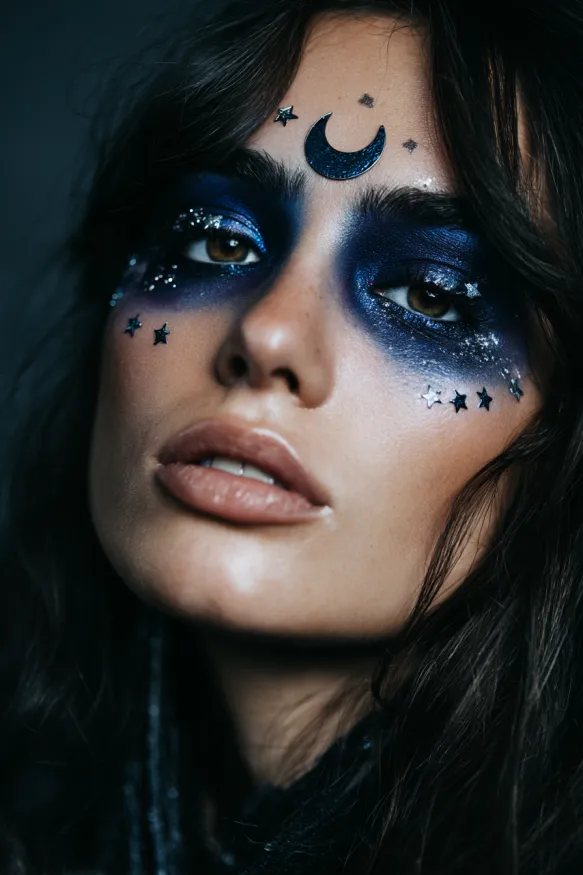 I absolutely love how magical and moody this makeup feels. The combination of stars and moon instantly transforms the face into a cosmic masterpiece, and the rich blue tones are just so striking. It’s the kind of style that makes me feel like a mystical goddess ready to rule the Halloween night.