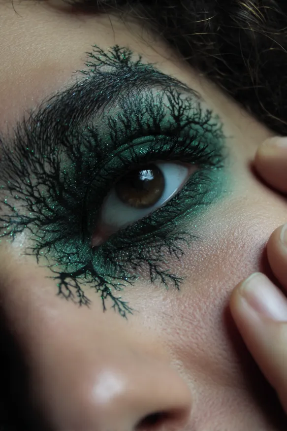 This eerie design uses rich green shadow as a base, with black branch-like patterns spreading out around the eye. The intricate details look like creeping tree roots or veins, giving the makeup an otherworldly, haunted feel. The shimmer in the green adds depth and makes the whole look glow with a mysterious energy.