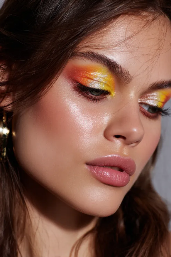 This radiant look blends fiery orange and bright yellow shadows across the lids, fading softly into a warm gradient. A touch of shimmer in the inner corners adds sparkle, while the seamless blending creates the illusion of a glowing sunset. The colors feel bold yet wearable, making the eyes stand out in a stunning, vibrant way.