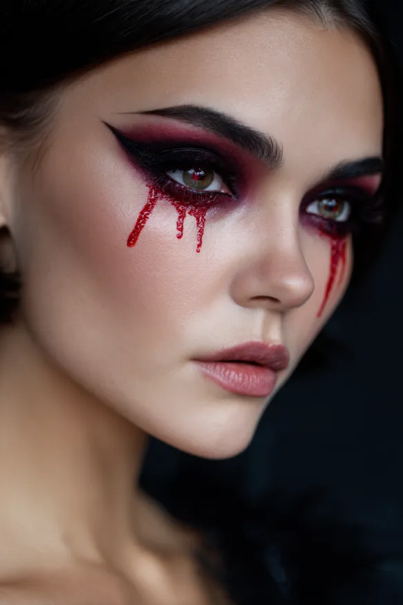 This look is all about drama with smoky red and black shadow blended into a sharp wing that extends past the outer corners of the eyes. Beneath the lower lash line, realistic streaks of red drip down like blood, adding a chilling yet artistic detail. The contrast between the precise liner and the messy, dripping effect makes this makeup bold and unforgettable.