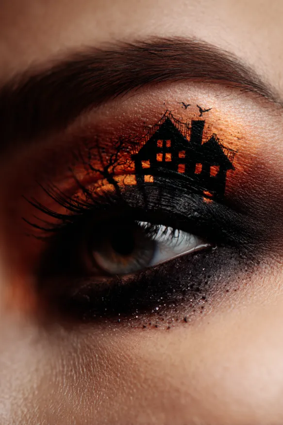 This dramatic look transforms the eyelid into a Halloween scene with a black haunted house silhouette painted against a fiery orange and gold background. Smoky black shadow deepens the lower lid, adding intensity, while tiny details like bare trees and flying bats make the design even spookier. The blending of warm tones with sharp black lines creates the perfect eerie contrast.