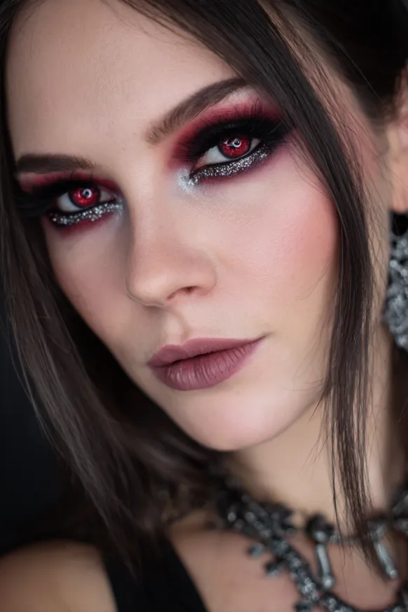 This bold look pairs smoky red and black shadow with shimmering silver highlights that make the eyes glow. Dramatic lashes frame the glittery lids, while blood-red contact lenses give the perfect vampiric touch. The overall effect is equal parts sultry and spooky, making it an ideal Halloween choice.