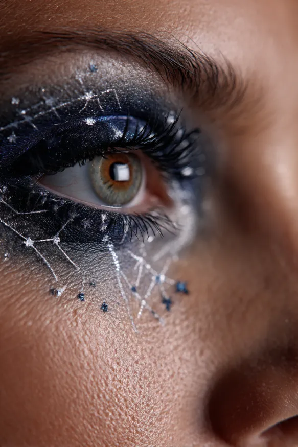 This celestial look features deep navy shadow blended with shimmering silver to mimic the night sky. Fine white lines and dots form delicate constellations around the eye, with tiny stars twinkling across the lower lash line. The effect is dreamy and enchanting, turning the eyes into their own little galaxy.