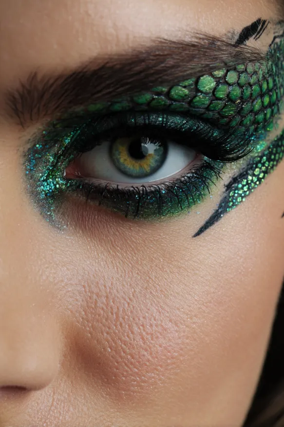 This fierce look features shimmering green shadow layered with black accents to create the illusion of reptilian scales. The detailed pattern extends from the eyelid outward, blending with glitter that catches the light for a hypnotic effect. The mix of emerald and darker tones makes the eye look piercing and mysterious, like something out of a fantasy world.