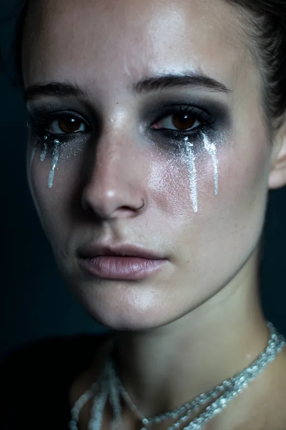 This dramatic look uses dark smoky shadow around the eyes with streams of silver glitter painted downward like dripping tears. The contrast between the smudged black and the sparkling glitter creates a hauntingly beautiful effect. It feels both sorrowful and glamorous, like a gothic version of crying diamonds.