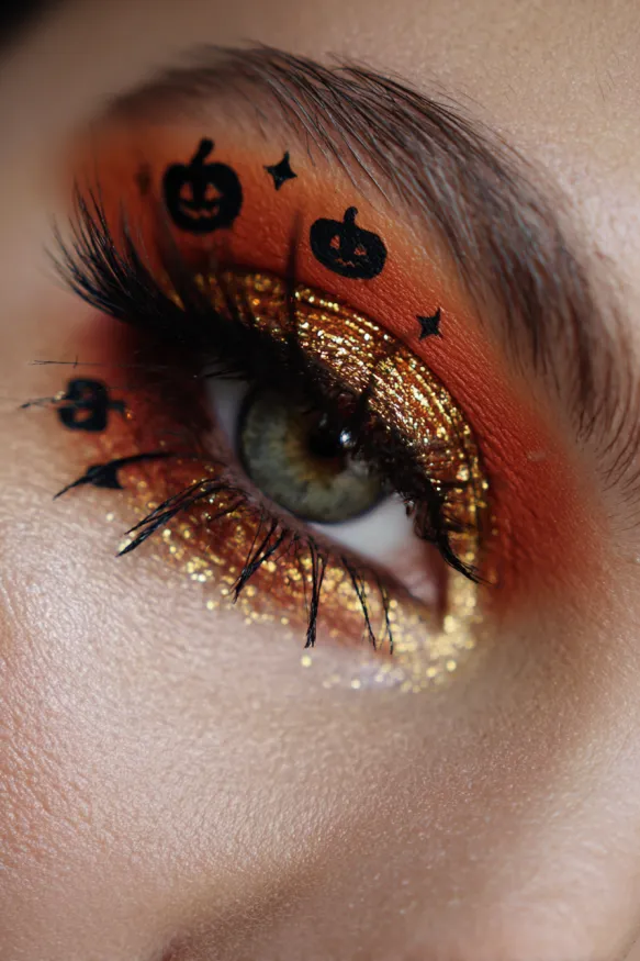This style features a shimmering gold base blended with bold orange shadow, creating a fiery Halloween glow. Tiny black pumpkin and star designs are drawn around the lid, giving the look a playful and festive twist. Long lashes frame the sparkling eyelid, making the entire eye pop with brightness and creativity.