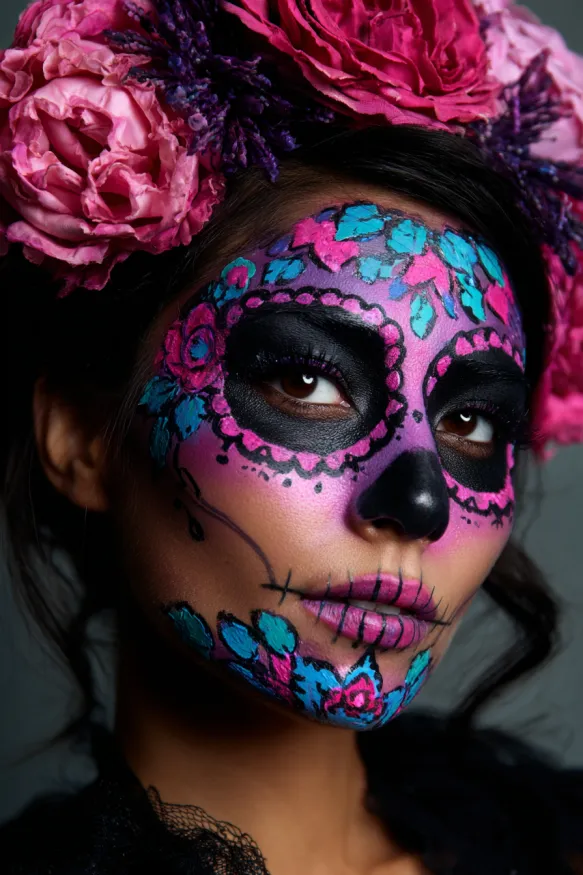 This makeup transforms the face into a vibrant sugar skull with bold black shading around the eyes that creates a hollowed, dramatic effect. Bright pink, blue, and purple floral patterns are painted across the face, blending beautifully with the black detailing for a striking Día de los Muertos inspired design. The look is completed with stitched lips and a crown of oversized pink flowers that ties everything together.