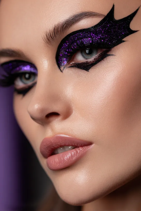 This look takes Halloween glam to a whole new level with bold bat-shaped wings stretching out from the eyes. The lids are coated in shimmering purple glitter, framed by sharp black lines that create a dramatic, winged silhouette. The combination of sparkle and edgy design gives off a mysterious, superhero-meets-vampire vibe that’s perfect for spooky season.