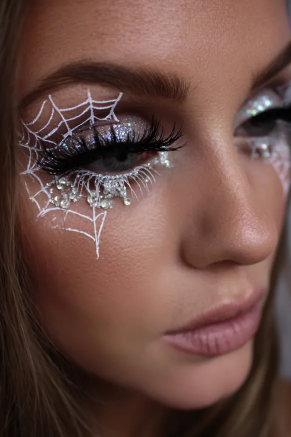 This look combines icy shimmer with delicate spiderweb designs drawn in white around the eyes. Glittery silver shadow creates a dazzling base, while rhinestones and pearls are placed along the lower lash line for extra drama. The bold lashes complete the effect, turning the eyes into a glamorous focal point that feels spooky yet elegant.
