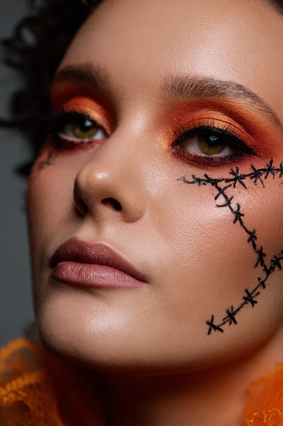 This look brings Halloween vibes with a fiery blend of orange, gold, and red shadows that light up the eyelids. The design is paired with bold black stitch details painted across the face, creating a stitched-doll or Frankenstein-inspired effect. The warm tones around the eyes add intensity, while the sharp stitches give it an edgy, spooky finish.