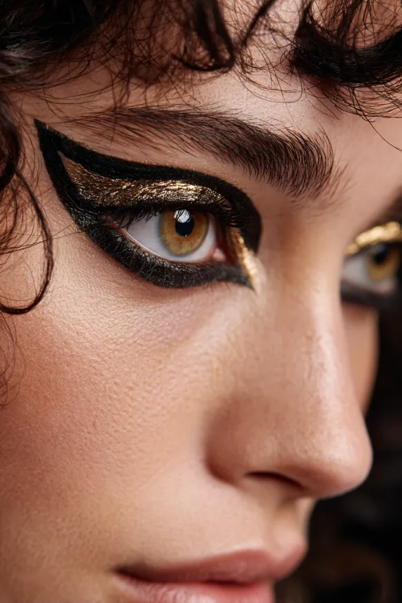 This striking look is built around bold, graphic black eyeliner that sweeps outward in dramatic wings. Metallic gold shadow fills the inner and outer corners, adding a regal shimmer that contrasts beautifully with the deep black. The sharp lines and metallic tones give the eyes a powerful, goddess-like intensity, perfect for a Cleopatra-inspired Halloween style.