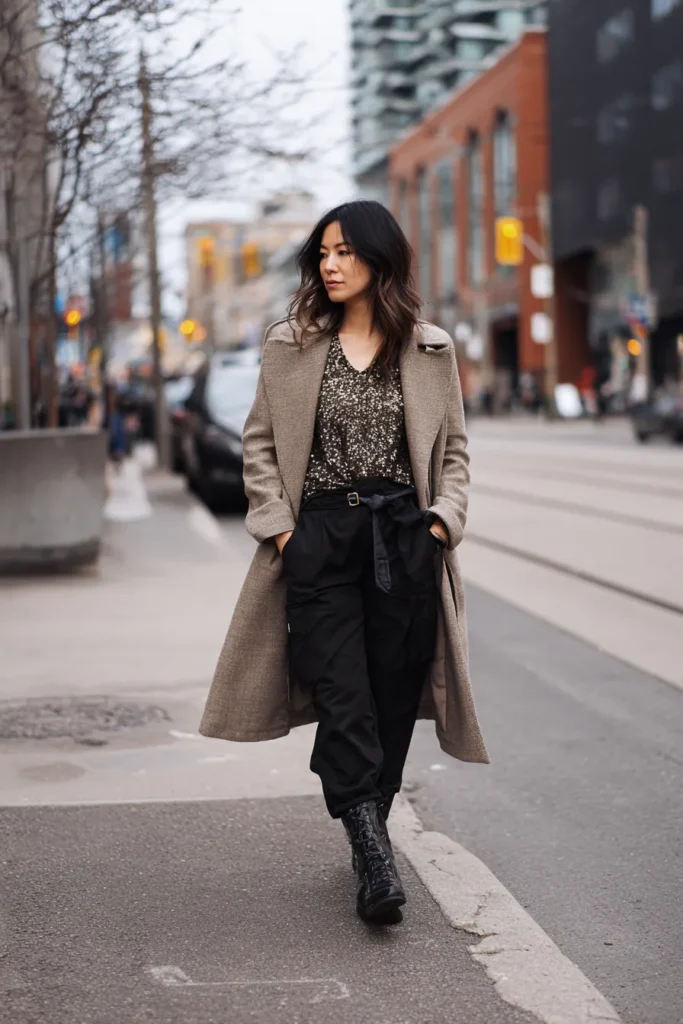 This look pairs a shimmery black sequin top with relaxed black trousers and glossy lace up boots. The outfit is layered with a long taupe coat that adds structure and warmth while keeping everything sleek and polished. The mix of sparkle on top and utility inspired pieces on the bottom creates a chic contrast that feels modern and city ready. The muted neutral coat balances the shine and keeps the whole outfit feeling cozy for cold weather.