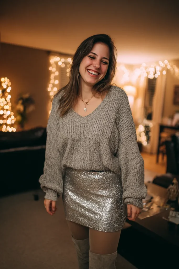 This outfit brings together a slouchy grey knit sweater with a silver sequin mini skirt that catches the light from every angle. The sweater adds that comfy lived in softness while the skirt delivers full New Year’s Eve sparkle. Neutral tights and over the knee grey boots keep the legs warm and elongate the whole look. The mix of textures feels festive and relaxed making it perfect for an at home celebration or a casual gathering with friends.