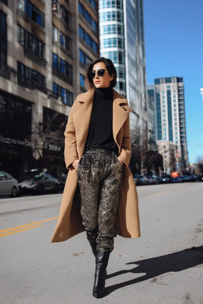 This outfit mixes festive shimmer with cozy warmth in the prettiest way. The sequin joggers bring all the New Year’s Eve sparkle while the black turtleneck keeps the top half sleek and streamlined. A long camel coat adds that soft winter polish and ties everything together with a refined neutral tone. Black heeled boots and sunglasses finish the look with a little extra confidence. The whole outfit feels glamorous but still practical for cold weather nights.