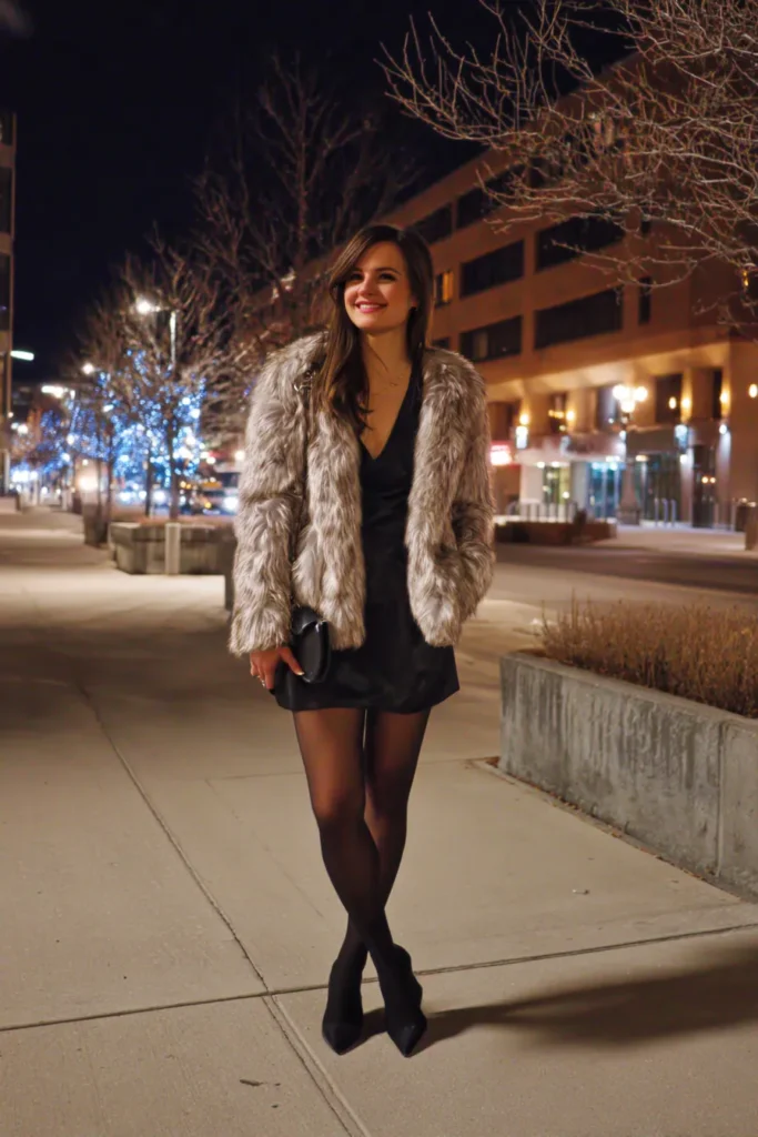 This outfit blends soft winter texture with classic party style. The faux fur jacket adds fluffy warmth and a touch of luxury while the black satin mini dress brings that timeless New Year’s Eve sparkle without actual glitter. Sheer black tights and pointed heels keep the look sleek and elongating. A small black clutch pulls everything together and the whole vibe feels polished with a hint of Hollywood drama.