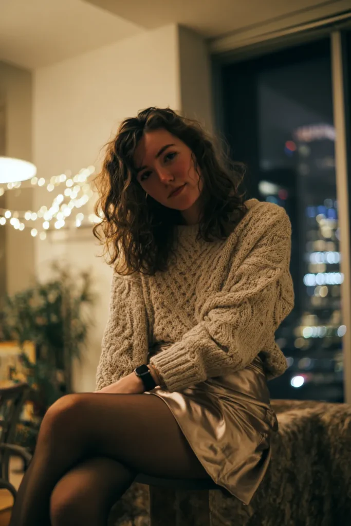 This outfit pairs a thick cable knit sweater in a soft oatmeal shade with a silky champagne satin mini skirt. The textures play so well together and give the look a warm holiday shimmer without any sparkles. Black tights add a bit of warmth and balance the shine of the skirt. The overall vibe feels relaxed and dreamy with the soft lighting and cozy setting adding to the charm.