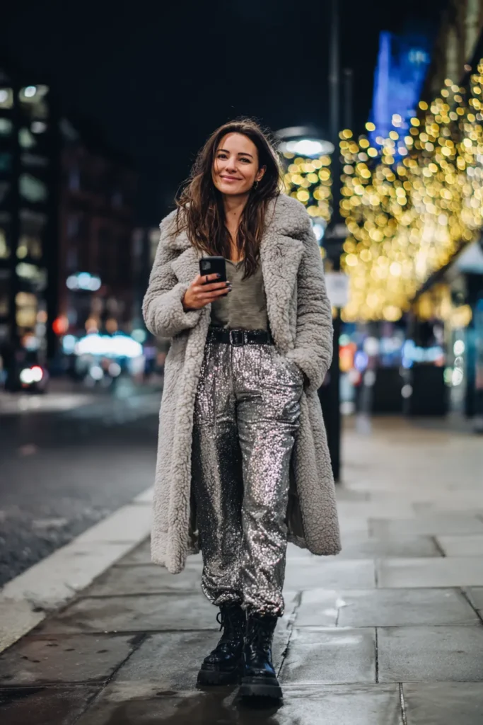 This outfit pairs high shine silver sequin joggers with a long fluffy teddy coat in a soft grey tone. The joggers bring all the festive sparkle while the coat adds that cozy winter layer everyone loves. A simple muted top keeps the shimmer as the focus and chunky black combat boots finish the look with a cool edge. The mix of textures feels fun and bold with the city lights making the sequins glow even more.