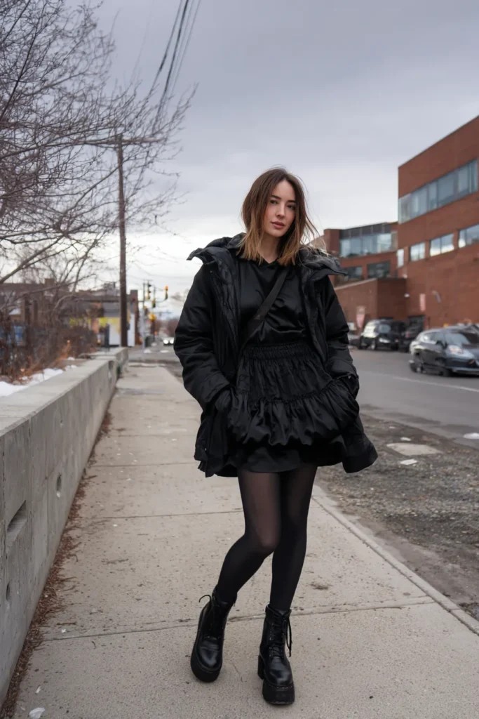 This outfit mixes a ruffled black satin mini skirt with a matching satin top for a sleek monochrome base. Layered over that is a warm black puffer jacket that keeps everything practical for cold weather while still looking stylish. Sheer black tights add a soft polished touch and chunky black combat boots bring in that cool confident edge. The whole look feels modern and bold with the textures creating just enough contrast to keep all the black interesting.