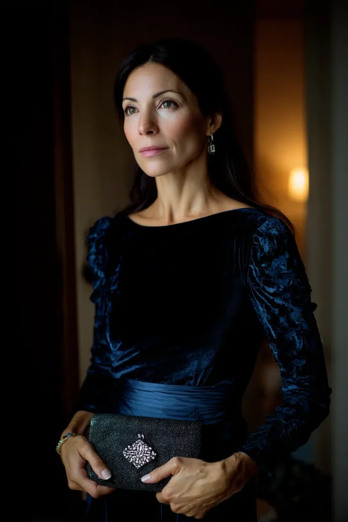 This look features a stunning midnight blue velvet gown that feels rich and elegant from every angle. The fabric has that soft sheen velvet is known for and the sculpted sleeves add a pretty textured detail that makes the dress feel extra special. The fitted waist creates a graceful line and the beaded black clutch adds a touch of sparkle without taking away from the deep moody blue. The whole outfit carries a quiet kind of glamour that feels timeless and refined.