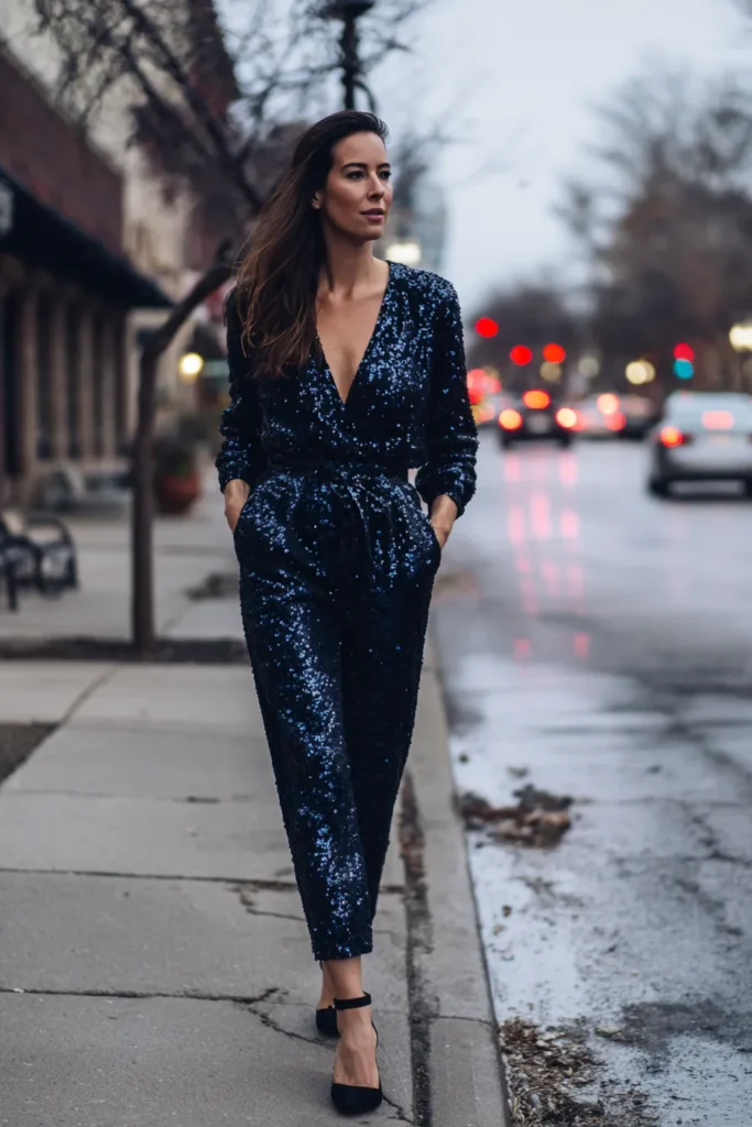 This outfit features a striking navy sequin jumpsuit that sparkles beautifully even in soft winter daylight. The long sleeves and tapered legs give it a sleek tailored shape while the deep V neckline adds a touch of glam that feels perfect for a festive night out. The matching fabric belt ties at the waist to create a flattering silhouette and the subtle ankle strap heels keep the look balanced and elegant. The whole vibe is modern confident and incredibly polished.