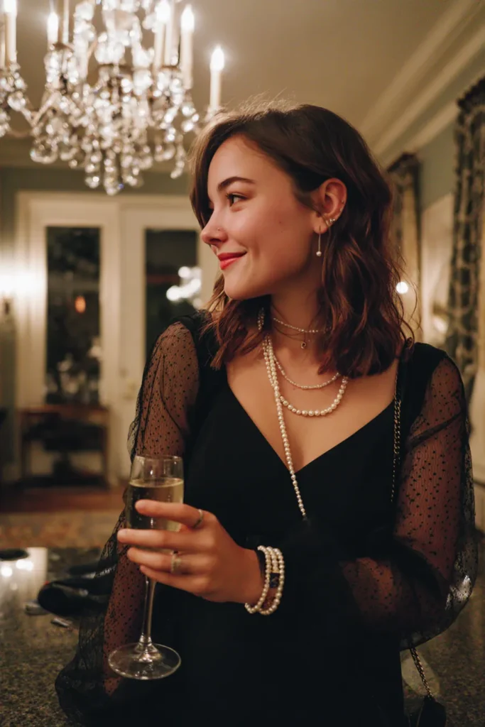 This outfit features a chic black dress with delicate sheer sleeves that add the prettiest soft texture. The sleeves have tiny dotted details that feel elegant without being too formal and the deep neckline gives the dress a flattering shape. The layered pearl necklaces instantly elevate the look and bring that classic old school glamour that always feels right for New Year’s Eve. With a sparkly bracelet stack and a simple champagne flute in hand the whole vibe feels festive feminine and beautifully polished.