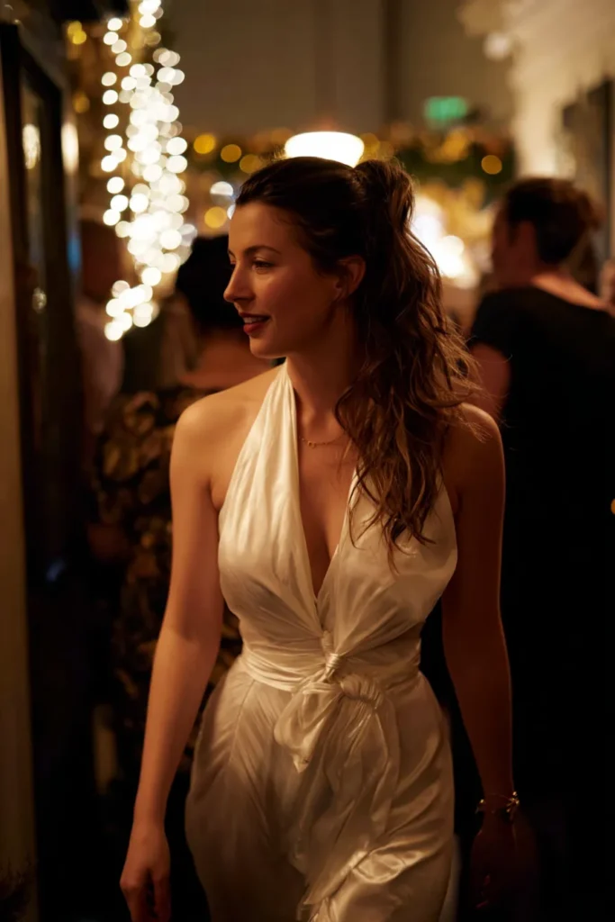 This outfit features a gorgeous white satin halter dress that feels smooth and luminous in the warm party lights. The deep neckline creates a lovely draped shape and the soft knot at the waist adds a touch of elegance without feeling fussy. The satin fabric catches light in the prettiest way and gives the whole look a polished luxurious vibe. Her loose ponytail and delicate gold jewelry keep everything effortless and romantic which fits perfectly with the cozy festive setting around her.