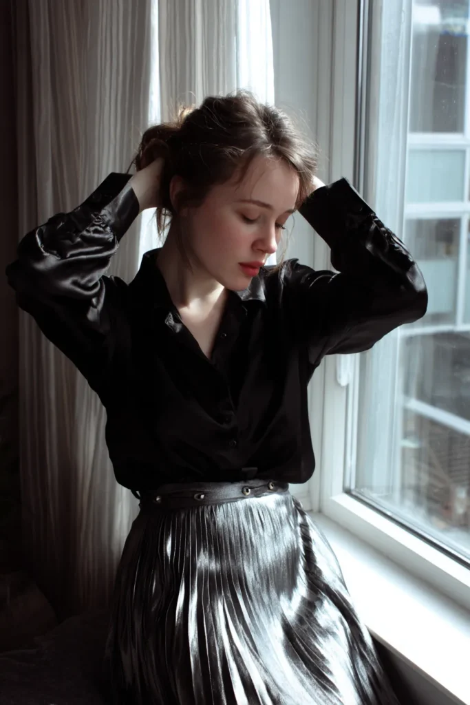 This outfit features a silky black satin blouse paired with a shimmering silver pleated skirt that instantly feels chic and festive. The blouse has a soft drape and subtle sheen while the skirt catches the light with every tiny movement. The contrast between the deep black and bright metallic silver creates a gorgeous balance that feels elegant without being too bold. With her hair loosely gathered and natural makeup the whole look feels refined relaxed and perfect for an evening celebration.