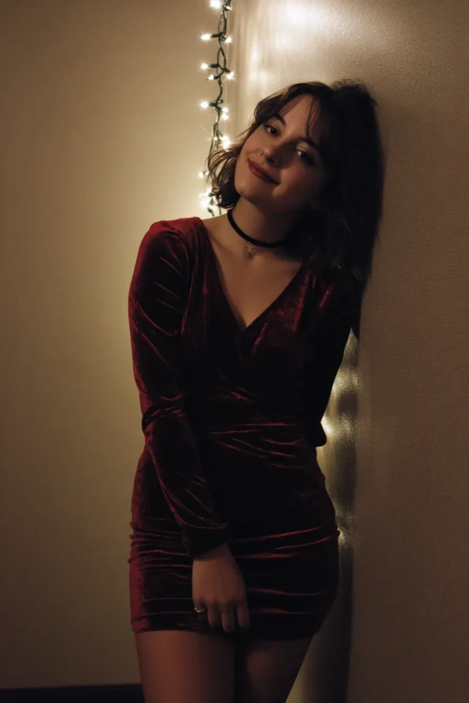 This outfit features a rich burgundy velvet mini dress that feels cozy and glamorous all at once. The fabric has that beautiful soft sheen velvet is known for and the long sleeves make it perfect for a chilly New Year’s Eve night. The deep V neckline adds a flattering touch while the fitted silhouette keeps the whole look polished. Paired with a simple black choker and warm string lights in the background the vibe feels nostalgic romantic and effortlessly cute.