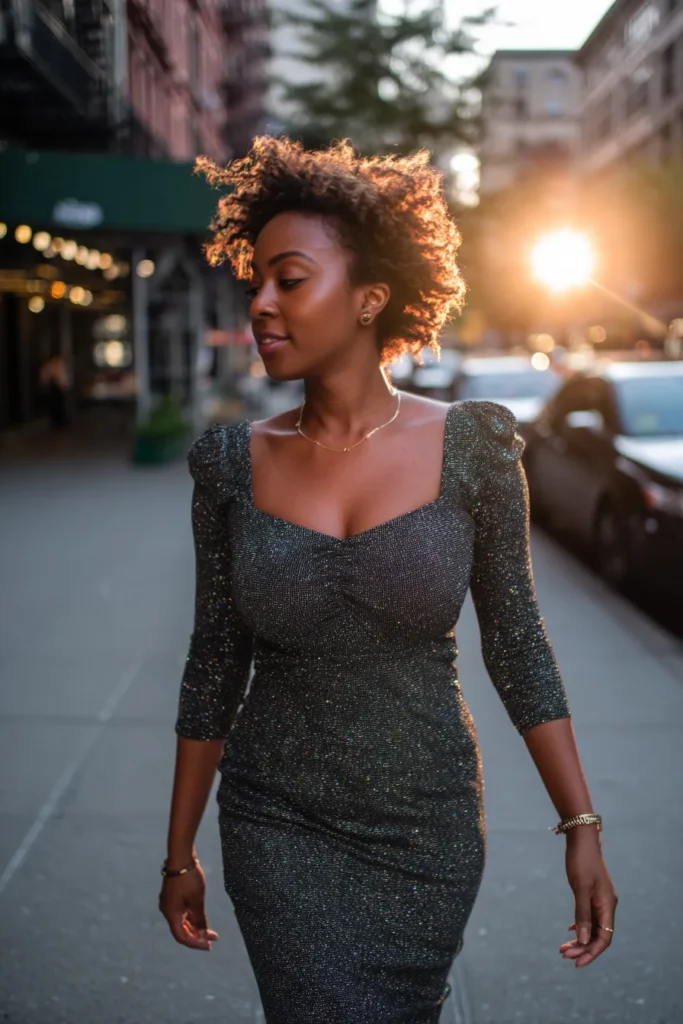 This outfit features a shimmering fitted metallic dress that hugs the figure in the prettiest way. The fabric is full of tiny sparkles that catch the light beautifully and the structured shoulders add a polished modern touch. The square neckline gives the dress a flattering shape and the three quarter sleeves make it feel elegant and evening ready without being too formal. Paired with simple gold jewelry and a soft glow from the sunset the whole look feels refined confident and perfect for a night out.