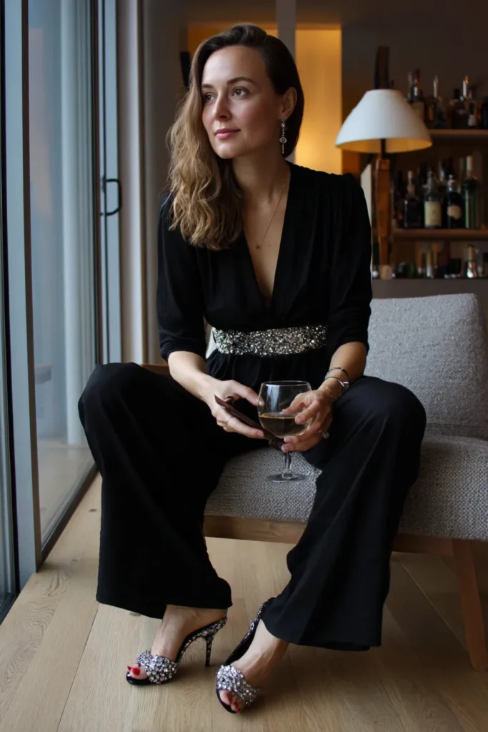 This outfit features a sleek black jumpsuit with a deep V neckline and a stunning sparkly waistband that catches the light in the prettiest way. The wide leg silhouette gives it a relaxed yet polished look and the soft fabric drapes beautifully as she sits. Paired with dazzling crystal embellished heels and delicate drop earrings the whole ensemble feels sophisticated modern and perfect for an elegant night in or out. The minimal gold jewelry and soft waves keep everything effortless and chic.