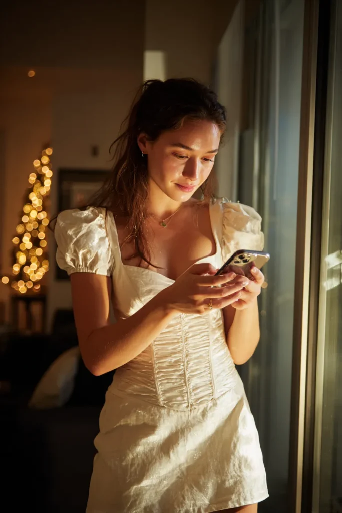 This outfit features a romantic ivory mini dress with puff sleeves and a corset style waist that creates the prettiest silhouette. The fabric has a soft glow in the warm evening light and the fitted bodice adds a touch of structure that balances the gentle sleeves. The square neckline gives it a sweet vintage inspired charm while the short hem keeps the look modern and fun. With delicate gold jewelry and a relaxed hairstyle the whole vibe feels youthful graceful and perfect for a cozy festive night.