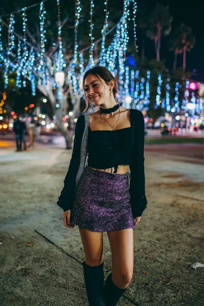 This outfit brings together a sparkly purple mini skirt that catches every twinkle of the holiday lights with a soft black velvet crop top that ties at the waist. The long sleeves add a bit of drama while the choker detail gives the look a fun playful twist. The textures feel rich and festive and the mix of glitter and velvet creates that perfect New Year energy. Tall black boots keep the outfit grounded while a shimmery bag adds just the right amount of extra sparkle.