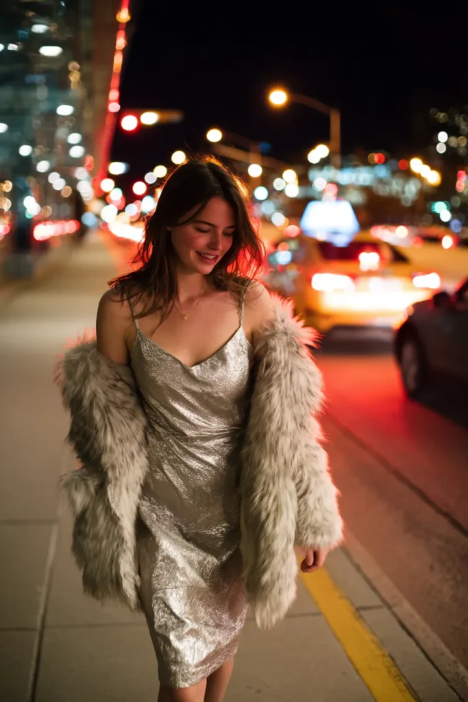 I love how this look blends cozy and sparkly in such an easy way. Some people love a slip dress because it always looks flattering and this silver one feels especially magical with all the reflections from the street. The faux fur coat adds that extra touch of luxury that makes me feel like I am stepping out for a special night. It is the kind of outfit that makes me feel warm, stylish, and totally ready to celebrate.