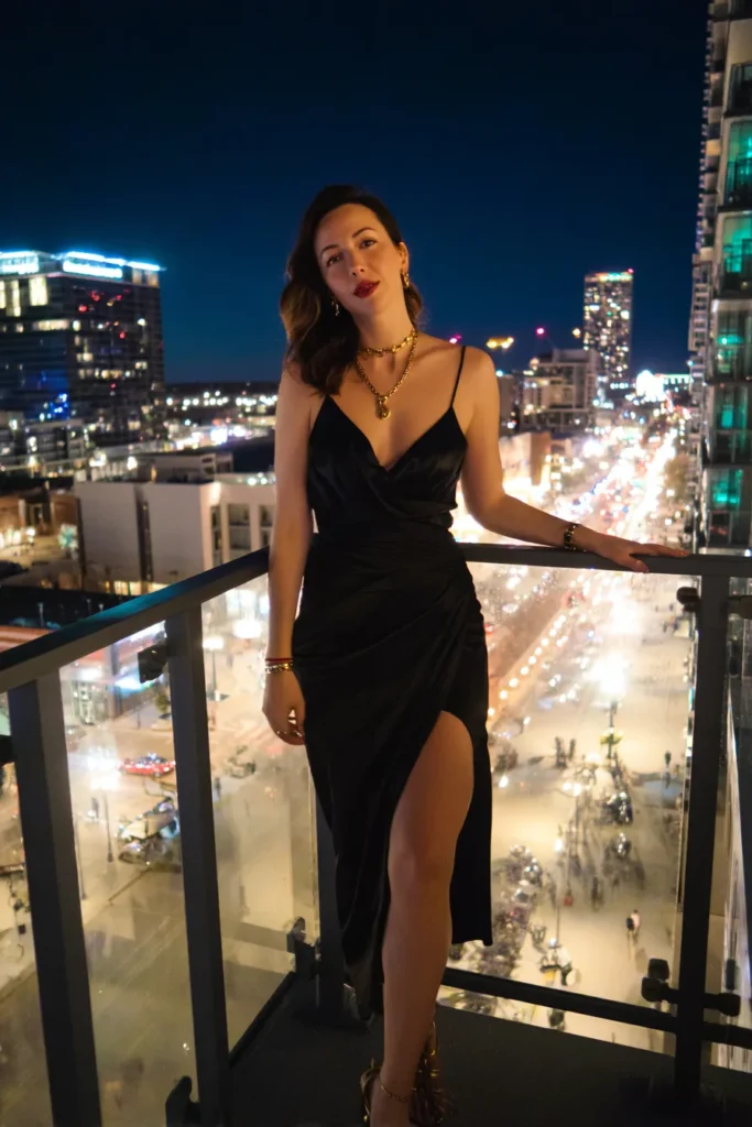 This satin black slip dress brings a sultry and elegant mood with its draped neckline, thin straps, and a high side slit that adds instant movement. The fabric has a soft sheen that catches the city lights in the prettiest way. Gold jewelry layers beautifully over the dark satin and adds a warm glow that ties the whole look together. The silhouette feels sleek and classic while the thigh high slit adds that bold New Year energy.